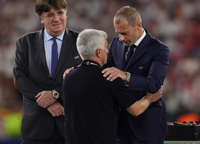 Það vakti athygli að Jose Mourinho, stjóri Roma var ekki með liði sínu þegar þeir tóku á móti silfurmedalíunni þar sem hann var þegar búinn að því og hafði yfirgefið völlinn.