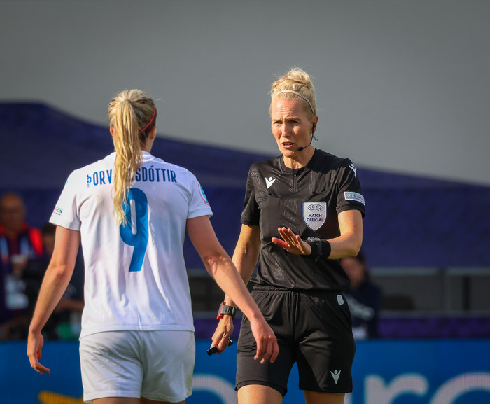 Hún fékk fyrst gula spjaldið en svo tók Lina Lehtovaara, dómari leiksins, spjaldið til baka.