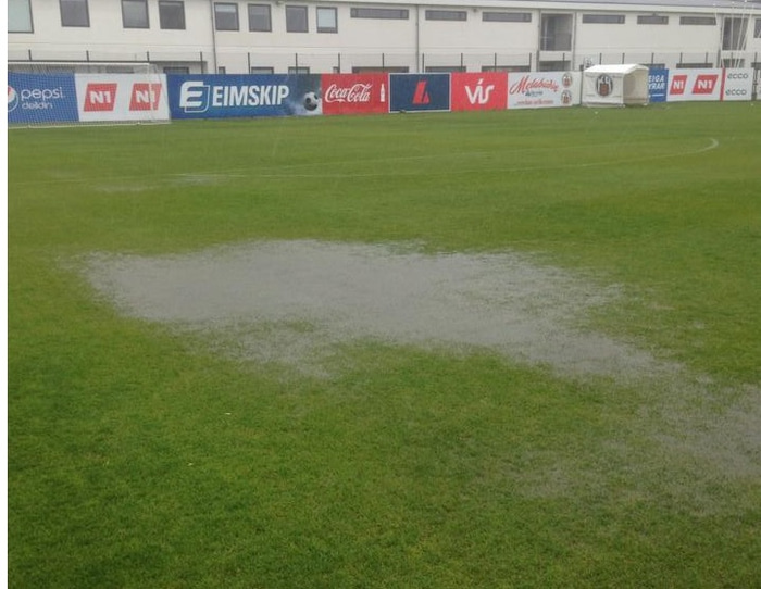 Meðal leikja er stórleikur KR og Stjörnunnar klukkan 18 en eins og sjá má á meðfyer stór pollur á KR-vellinum.