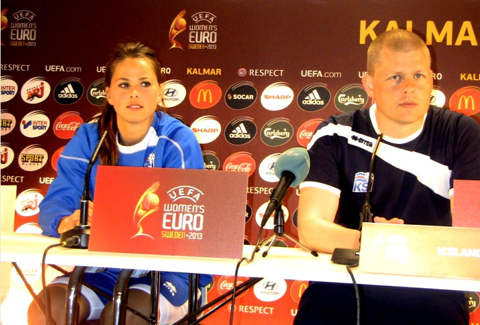 Sara og Sigurður Ragnar Eyjólfsson, sem valdi hana fyrst í A-landsliðið þegar hún var leikmaður Hauka.