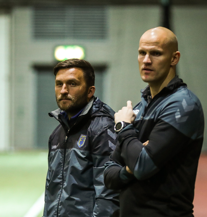 Ólafur Páll Snorrason þjálfari Fjölnis og Gunnar Már Guðmundsson aðstoðarþjálfari.