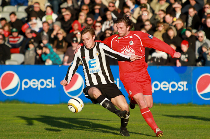 50 mín: Bjarni Guðjónsson fær gult spjald fyrir brot, beint fyrir framan nefið á Gunnari Jarli.