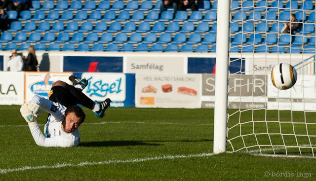 55.mínHörður Sveinsson fékk sendingu inní teig og skaut hann boltanum fast niðri en Jack Giddens varði boltann og missti hann aðeins frá sér og Arnar Sveinn Geirsson var að koma en Jack Giddens náði boltanum áður en Arnar náði til hans.