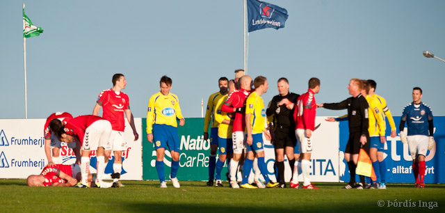 Á 90. mínútu fékk Óli Baldur Bjarnason rautt spjald eftir ljóta tæklingu á Hauk Pál Sigurðsson. Það var næstum soðið uppúr eftir þetta atvik en Magnús Þórisson dómari leiksins hélt ró sinni og náði mönnum aftur niður á jörðina.