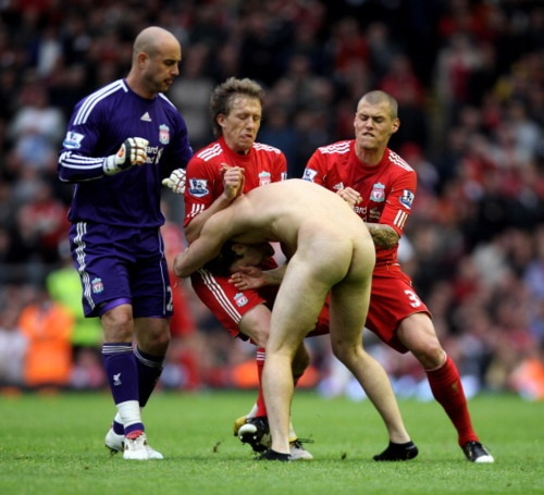 Hér til hliðar má sjá skemmtilega mynd af þeim Pepe Reina, Lucas Leiva og Martin Skrtel að glíma við strípalinginn í dag.