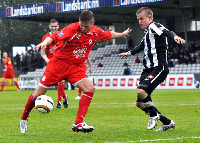 Heimamenn brugðust þó vel við því að einungis þremur mínútum síðar var Baldur Sigurðsson búinn að jafna metin með skalla eftir fyrirgjöf frá Kjartani Henry Finnbogasyni. Þess á milli hafði Ásgeir Örn Ólafsson farið illa með gott færi, Lotto skórnir eitthvað aðeins að klikka í bleytunni.