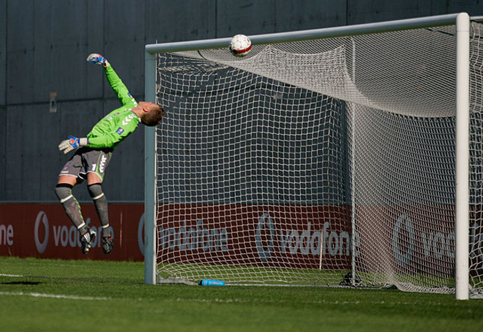 En þá kom fyrsta markverða færi leiksins og þar var á ferðinni Sam Mantom fyrir Hauka. Hann fékk flotta sendingu inn í teig, tók boltann laglega niður og átti hörkuskot sem Albert varði virkilega vel, en boltinn fór í stöngina og virtist á leið inn en Albert bjargaði á síðustu stundu.
