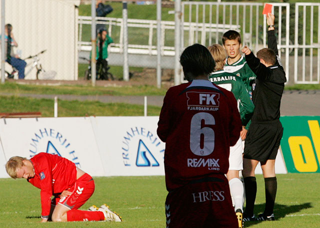 Ekki skánaði ástandi fyrir Blika þegar Elfar Freyr Helgasyni var vikið af velli á 45. mínútu fyrir litlar sakir. Svo virtist sem Hilmar Geir Eiðsson hafi misst boltann of langt frá sér og Elfar tæklað hann. virkilega vafasamur dómur.