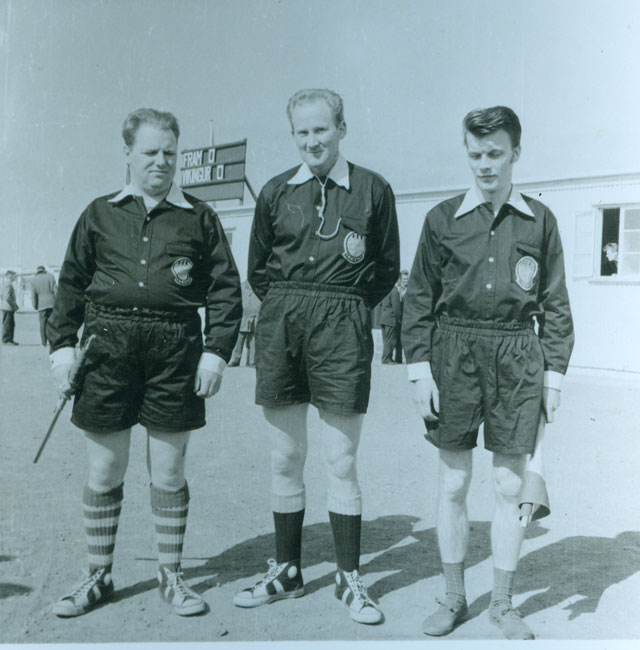 Dómaratríó á gamla Melavellinum - fyrir leik Fram og Víkings 1959. Guðjón Einarsson, ljósmyndari, Val, Grétar Norðfjörð Þrótti, formaður KDR, og Björn Karlsson, Þrótti.