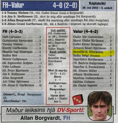 Fimmtudaginn 29. maí 2003 fékk ég gríðarlega óverðskuldað rautt spjald í leik með Val gegn FH. Stórvinur minn Henry Birgir, blaðamaður DV á þessum tíma, skrifaði um leikinn og segir að þetta hafi alltaf verið rautt. Ég segi hið gagnstæða.