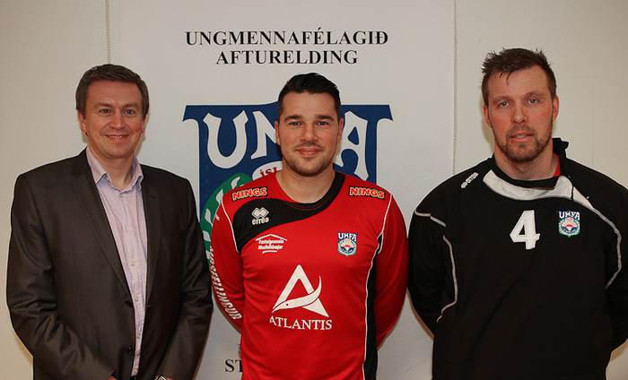 Á myndinni má sjá (frá vinstri) Pétur Magnússon formann meistaraflokksráðs karla hjá Aftureldingu, Guðmund og Baldvin Jón Hallgrímsson aðstoðarþjálfara þegar gengið var frá samningum fyrr í kvöld.