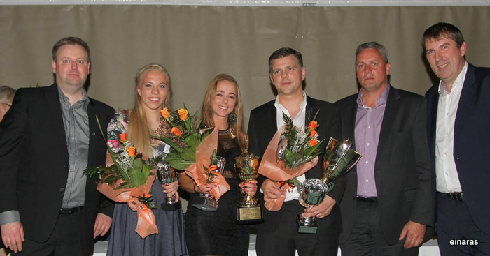 Á myndinni talið frá vinstri:Ólafur Gunnar Pétursson, Hulda Hrund Arnardóttir efnilegust í mfl.kv. Anna Björg Björnsdóttir best. Ásmundur Arnarson tók við verðlaunum fyrir Viðar og Elís sem voru bestir og efnilegastir. Síðan koma Ásgeir Ásgeirsson og Þorvaldur Árnason.
