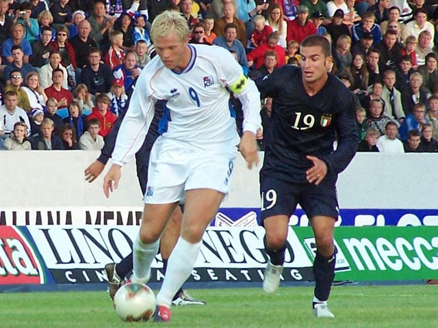 Eiður fagnaði með "Bréfberadansinum" sem að hann og Sveppi gerðu vinsælan síðastliðið sumar í auglýsingum í sjónvarpi. Áhorfendur í Laugardalnum fóru að syngja sigursöngva en mínútu síðar átti Marco Di Vaio fínt skot fyrir Ítali en hinn fertugi Birkir í markinu varði vel.