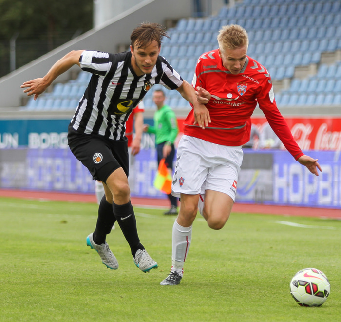 Skömmu síðar skoraði hins vegar Bjarni Ólafur glæsilegt skallamark eftir frábæra hornspyrnu frá Sigurði. Bjarni Ólafur mætti askvaðandi og hamraði knöttinn í netið með höfðinu.
