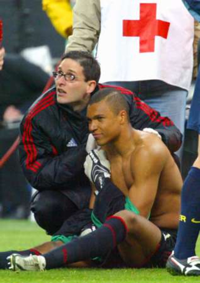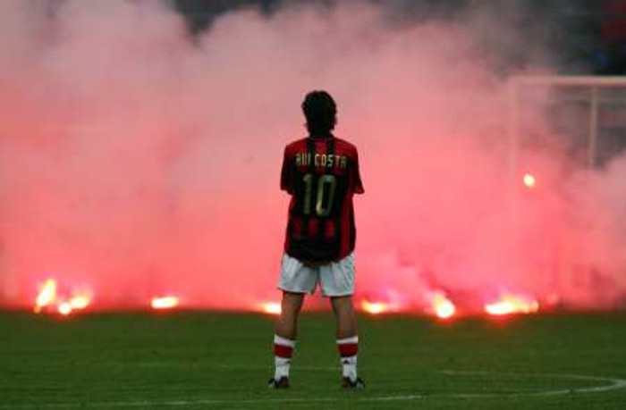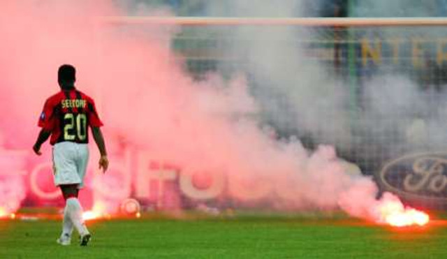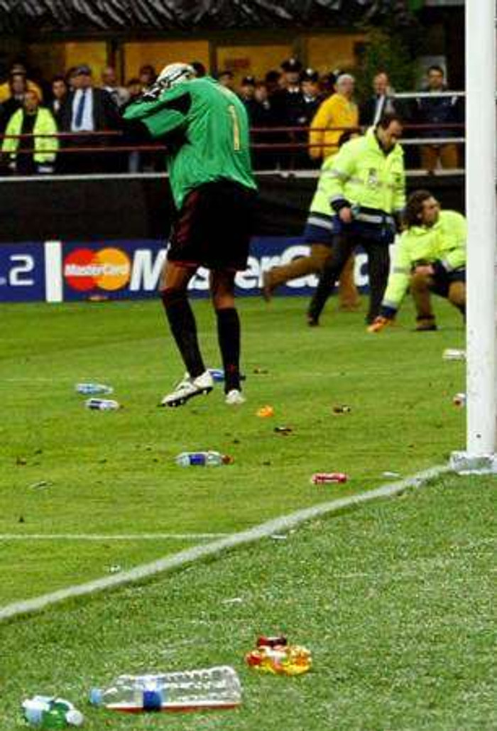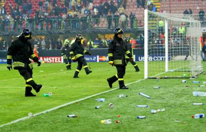 Stuðningsmenn Inter fóru að grýta flöskum, blysum og allskonar dóti og drasli inn á völlinn. Blys lenti í öxl markvarðar AC Milan, Dida, og þurfti hann aðhlynningu. Á meðan hann lá á vellinum reyndu leikmenn Inter að biðla því til stuðningsmanna liðsins að hætta að grýta hlutum inn á völlinn en ekkert gekk.