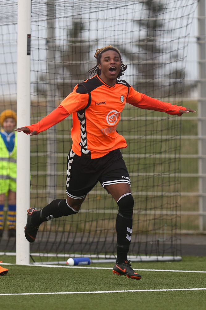 Atvikið átti sér stað á 27. mínútu leiksins, en Jordan Tyler festist í skraufaþurru gervigrasvellinum.