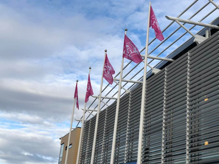 Í kvöld mætast Ísland og Frakkland í undankeppni EM en KSÍ tekur þátt í bleika deginum með því að flagga bleikum fánum við Laugardalsvöll eins og sjá má á meðfylgjandi mynd.
