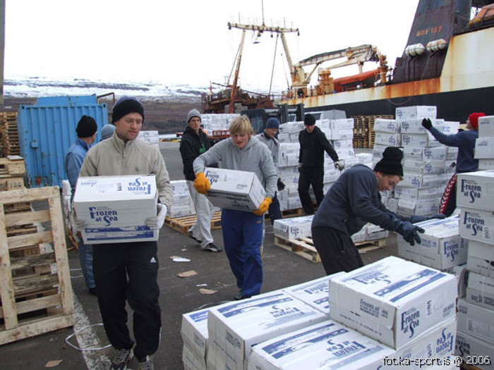 Löndunin felur í sér að bera kassa af frosnum fisknum í land og raða honum á bretti. Þau eru síðan plöstuð og komið fyrir í geymslu.
