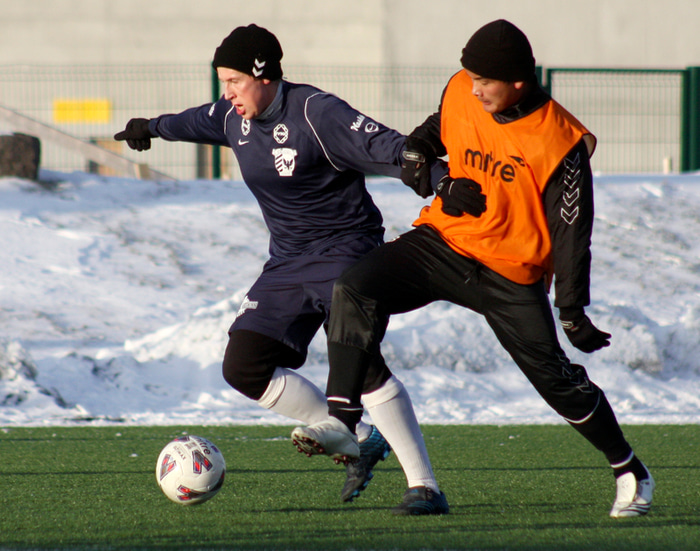 Það er bara ljómandi góð stemmning enda styttist óðum í að tímabilið hefjist og að menn fái að komast á alvöru gras. Það er mikið af nýjum leikmönnum í okkar hóp og mikil tilhlökkun á meðal leikmanna, aðstandenda sem og bæjarbúa almennt fyrir sumrinu.