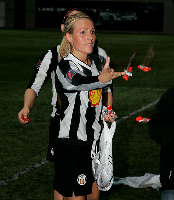 Þær KR-stúlkur sem voru farnar af velli gáfu áhorfendum Kit Kat þegar úrslit leiksins lágu ljós fyrir á meðan lokasekúndurnar voru leiknar.