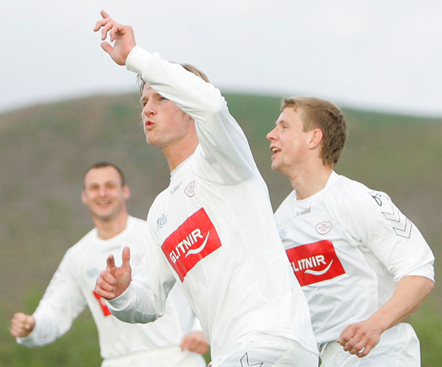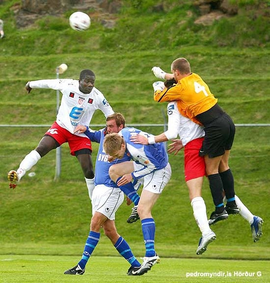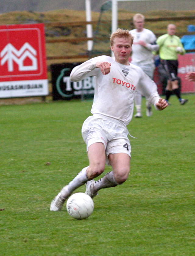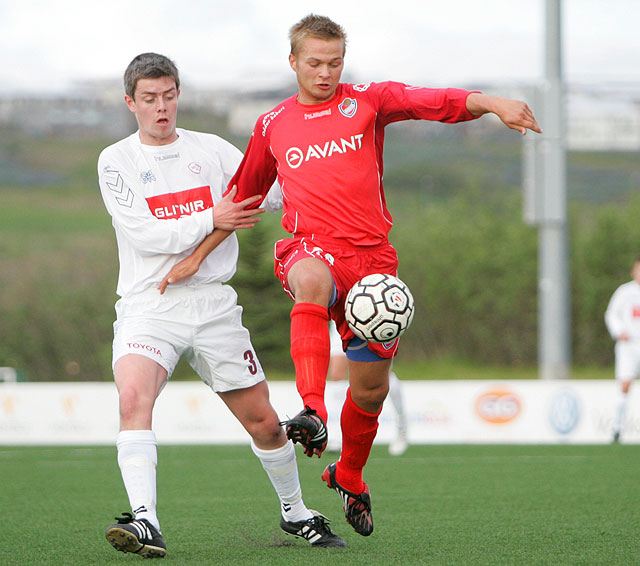 Atli Heimisson var svo nálægt því að skora fjórða markið þegar hann komst einn í gegn eftir glæsilega þversendingu frá Bjarna Rúnari. Atli vippaði boltanum yfir Srdjan í markinu en Haukur Ingvar Sigurbergsson, fyrirliði gestanna, náði að hreinsa áður en Atli komst að boltanum. Illa farið með gott færi.