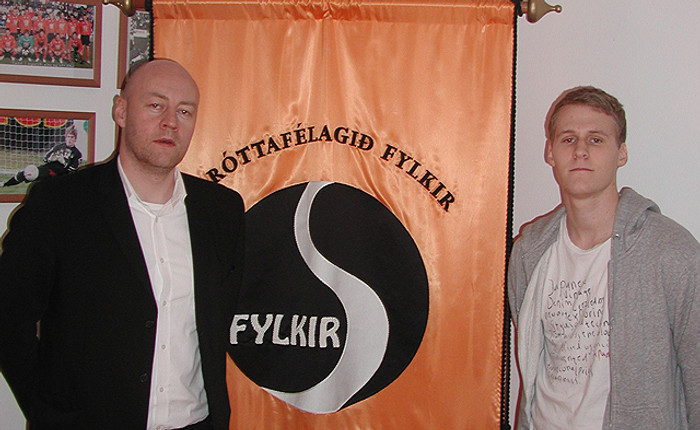 Oddur Ingi Guðmundsson sem er hér hægra megin á myndinni gekk til liðs við uppeldisfélag sitt, Fylki, í vetur frá Þrótti. Hann fór úr hnélið á æfingu liðsins í gær.