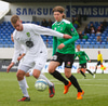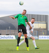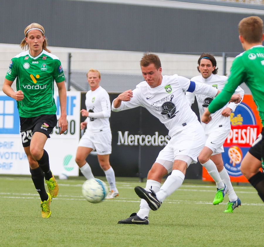 Ismar Tandir með skot af löngu færi úr aukaspyrnunni. Pétur Már í marki KFG öryggið uppmálað.