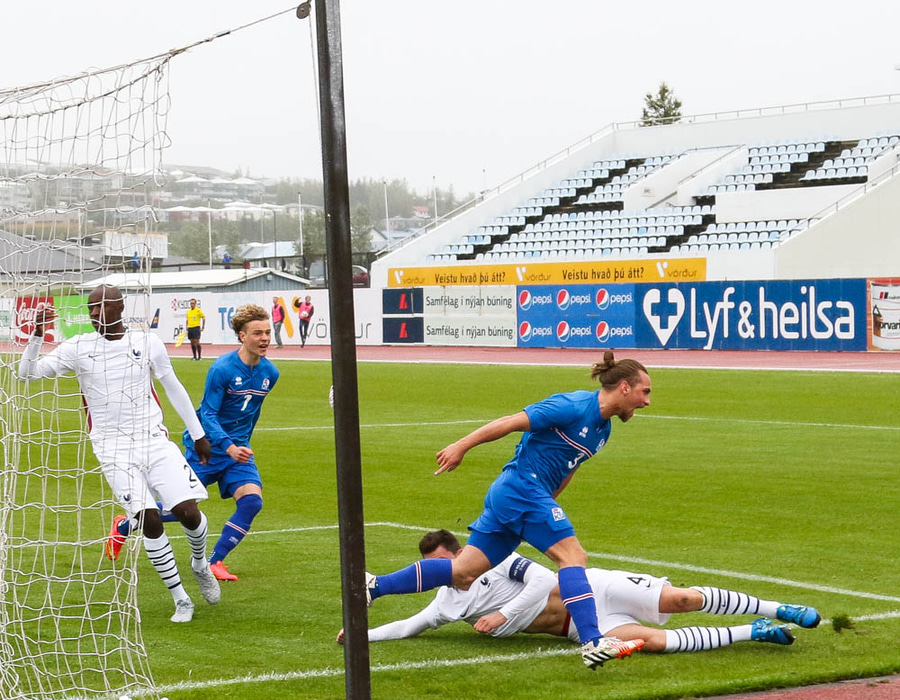 Váá Aron Elís! Ég myndi frekar vilja hafa þennan gaur í liðinu mínu heldur en alla þessa Frakka, hann er fáránlegur!!! Elías Már vinnur boltann inni á miðjunni og kemur honum á Aron Elís, sem er stórkostlegur á boltanum, kemur með hnitmiðaða sendingu inn á Ævar sem reynir að fleyta honum áfram á Höskuld en franska vörnin bjargar. En goddamn Aron Elís, þvílíkur leikmaður!