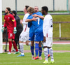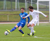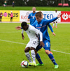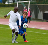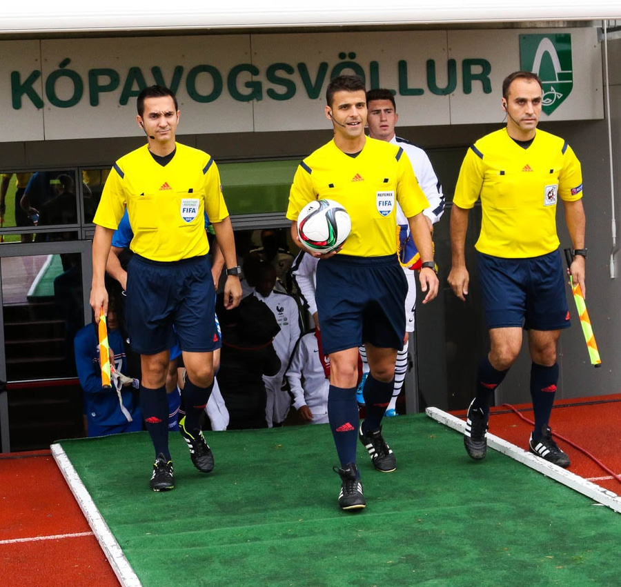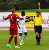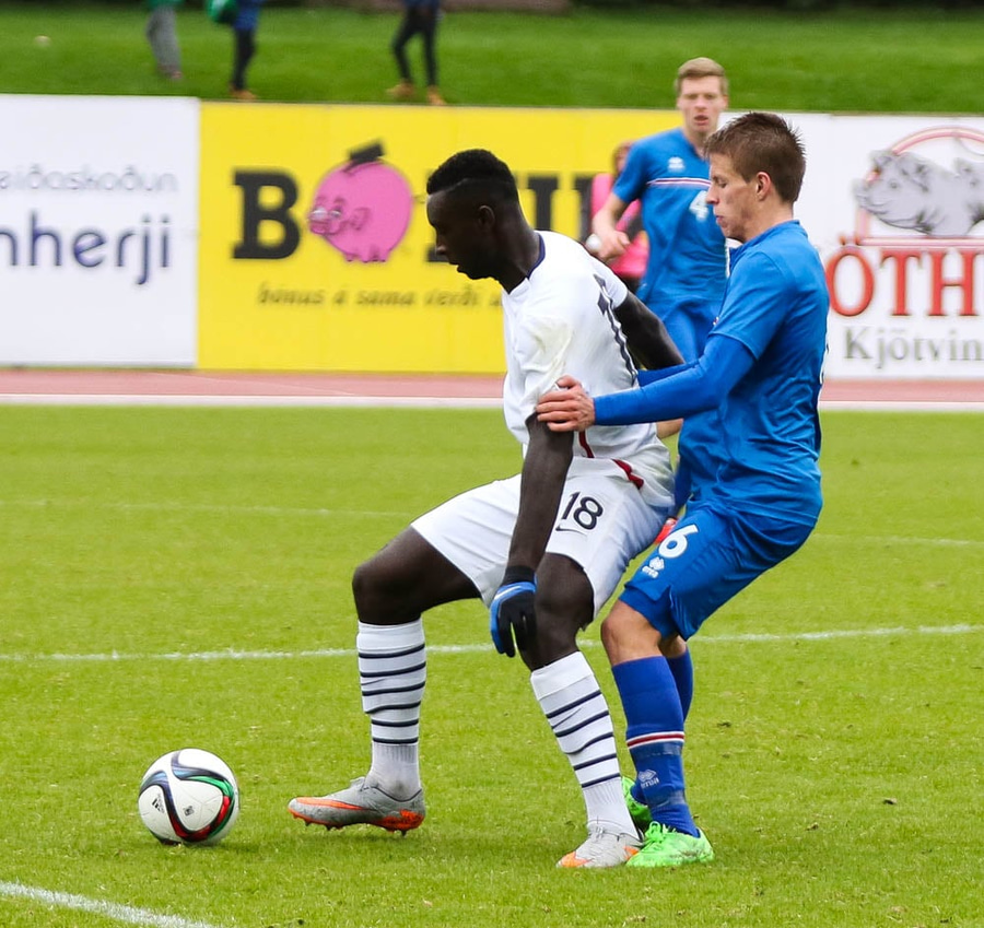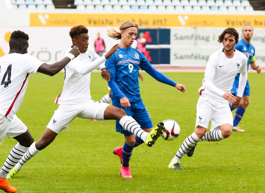 Ævar fær að líta gula spjaldið fyrir brot á Kingsley Coman. Strákarnir harðir í horn að taka en verða að passa sig.