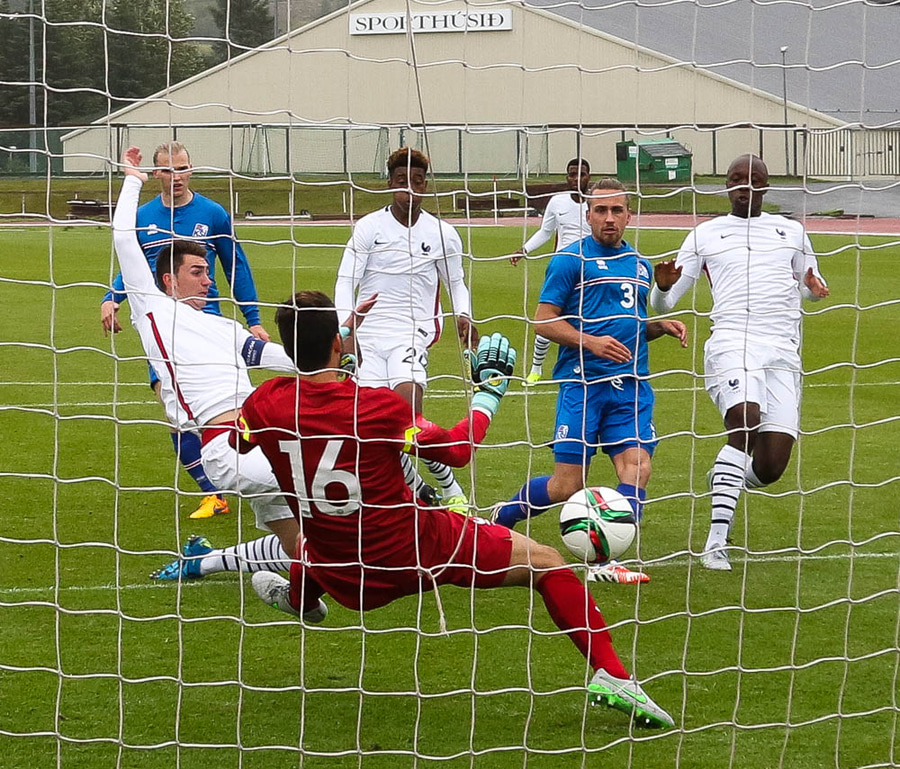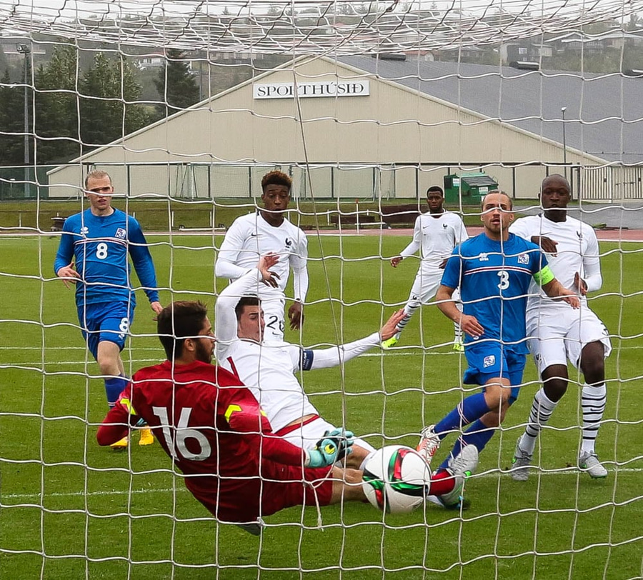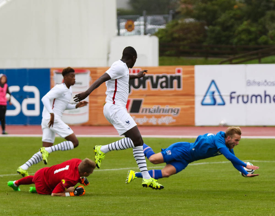 Þarna munaði litlu!! Fín sókn hjá Frakklandi, Kingsley Coman fær boltann og skapar sér fínt skotfæri, lætur vaða en Frederik ver vel frá honum.
