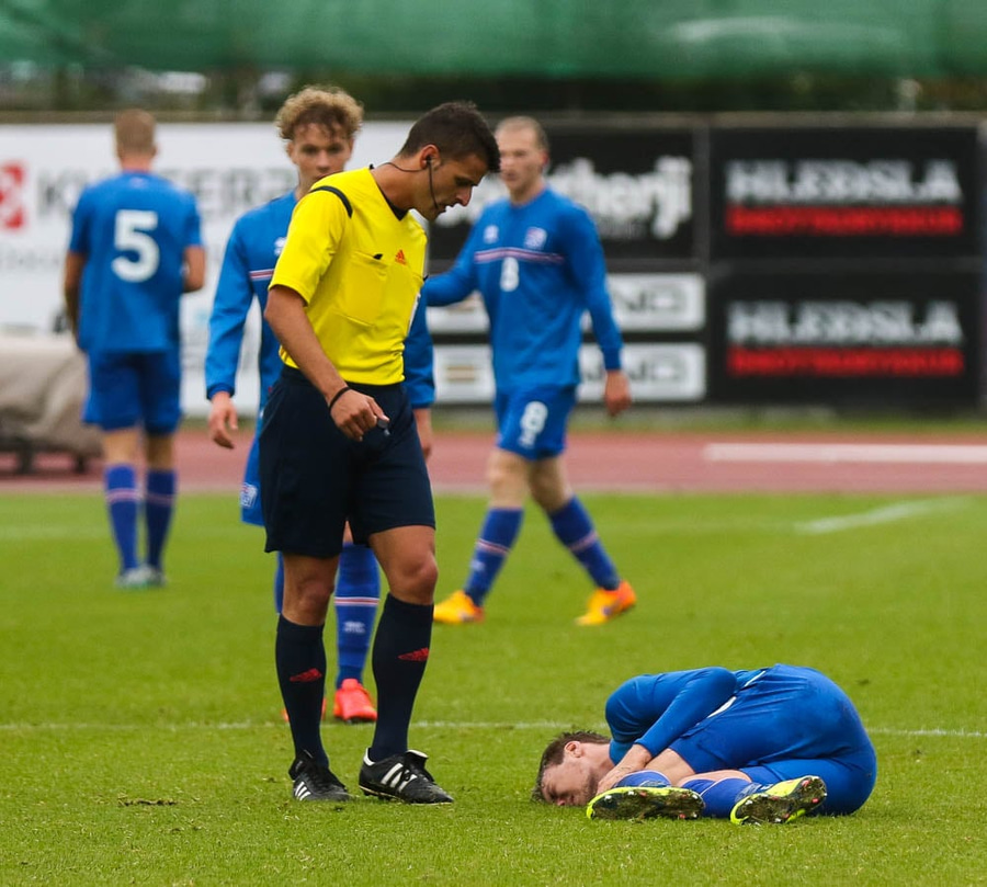 Mjööög vondar fréttir!! Aron Elís liggur á vellinum sárþjáður og heldur utan um hnéð! Vonandi er þetta ekki alvarlegt, það væri alveg grátlegt.. mér sýnist samt hans þátttöku í dag vera lokið.