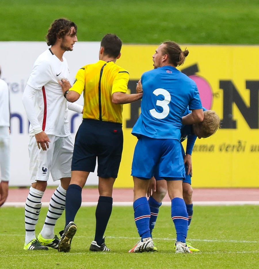 Það er allt að sjóða upp úr! Böddi Löpp nær að gera Adrien Rabiot alveg brjálaðan og Rabiot reynir að hrinda honum af alefli.. heppinn að fá ekki annað gult. Svo hitnar aftur í hamsi í teignum þegar Frakkar fá aukaspyrnu en dómarinn nær að róa menn. Frakkar auðvitað BRJÁLAÐIR að vera að tapa gegn litla Íslandi!