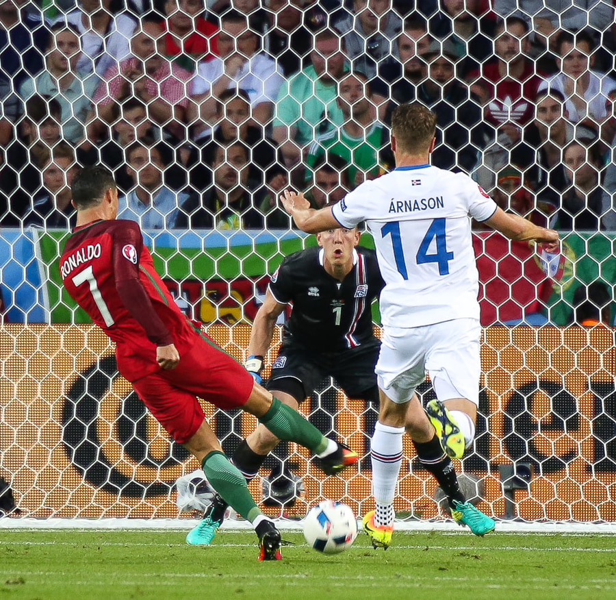 Ronaldo missir boltann útaf við gríðarlega kátínu íslensku stuðningsmannana.