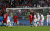 Raphael Guerreiro með fyrirgjöf á Nani sem skallar svona millimeter framhjá. Hjartað í heilli þjóð stoppaði þarna.