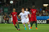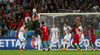 Ísland sækir í átt að íslensku stuðningsmönnunum. Púað vel á Hannes þar sem hann er í marki fyrir framan þá portúgölsku.