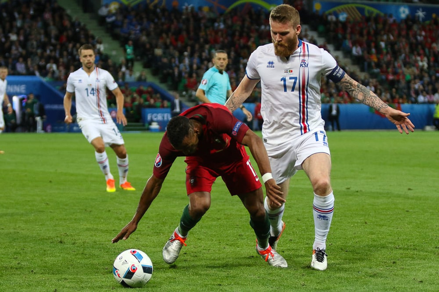 Renato Sanches með hættulega fyrirgjöf en Aron Einar er mættur að bjarga, enn og aftur. Einn af hans betri landsleikjum.