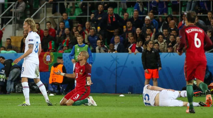 Mig langar að skrifa rosalega ljóta hluti um Pepe akkurat núna. Sparkaði hressilega frá sér eftir að Jón Daði var dæmdur brotlegur. Skíthæll, látum það nægja.