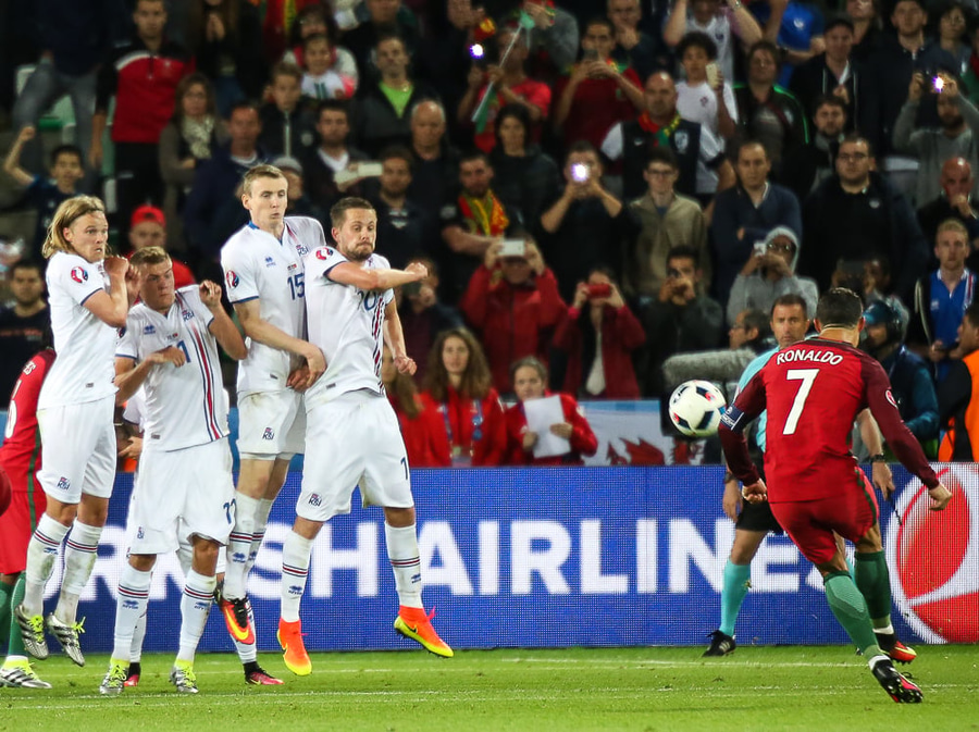 Með síðustu spyrnum leiksins. 35 metrar ca. Ronaldo tekur það. Ekkert bull núna.