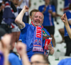 Það stendur 99% af stuðningsmönnum Íslands á meðan 99% Portúgala sita. Rúst í stúkunni, enn og aftur.