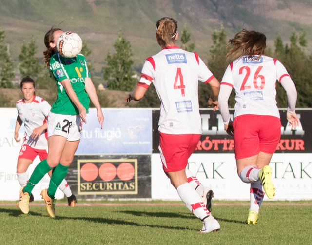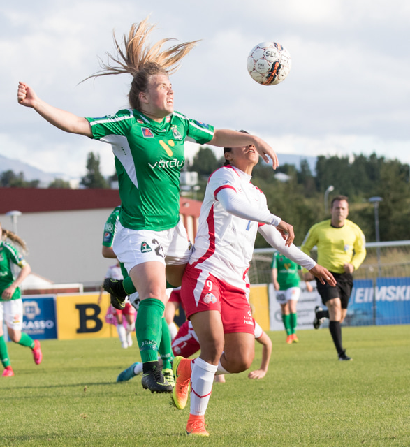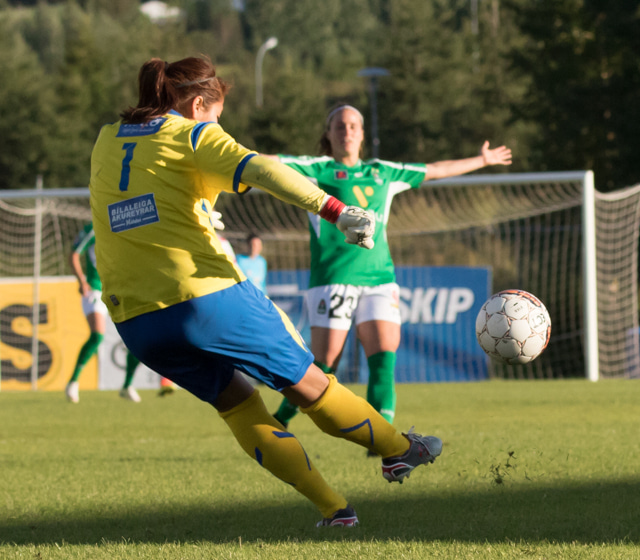 Hallbera með aukaspyrnu við miðlínu, Aurora í marki Þórs/KA misreiknar boltann og þarf að setja hann í horn. Þarna munaði ekki miklu!