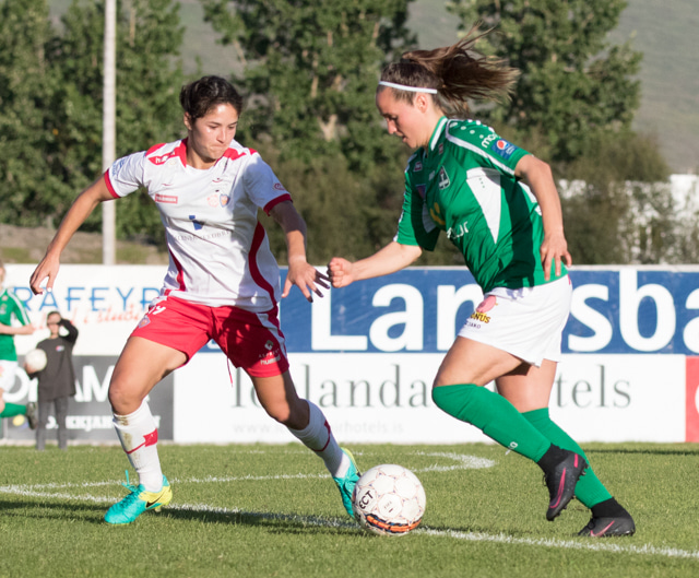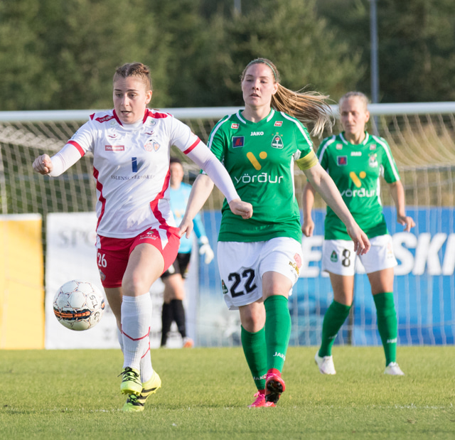 Nú var það Sandra Mayor sem átti flottan sprett, stoppaði inn í teignum, tók gabbhreyfingu og gaf fyrir á Huldu Ósk. Hún þurfti að teygja sig í boltann og setti hann þess vegna yfir markið.