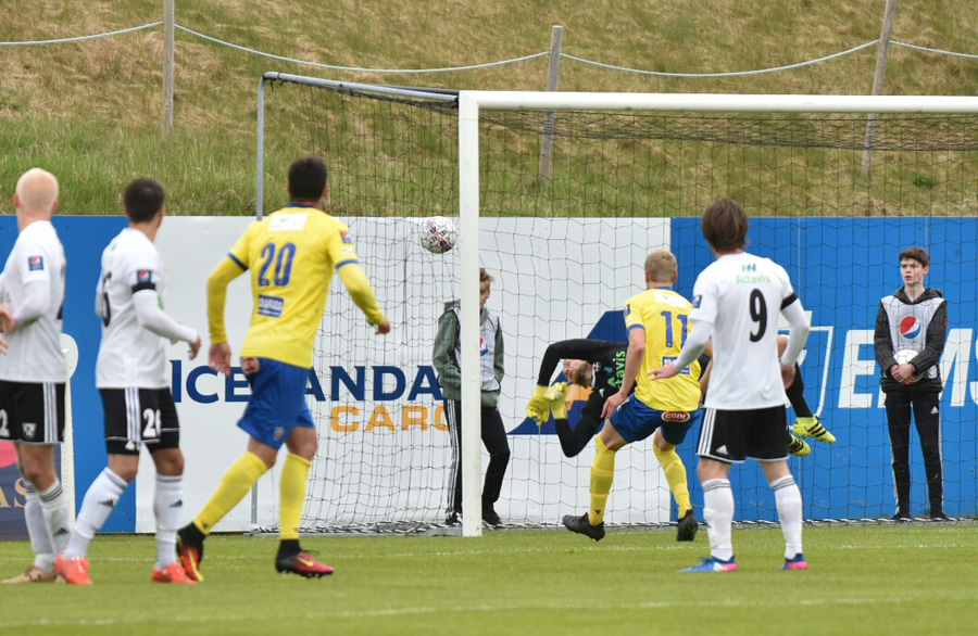 Jææææks! Hallgrímur Mar fiskar aukaspyrnu á stórhættulegum stað við teigshornið. Þetta var hársbreidd frá því að verða víti.
