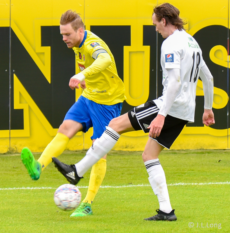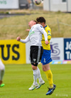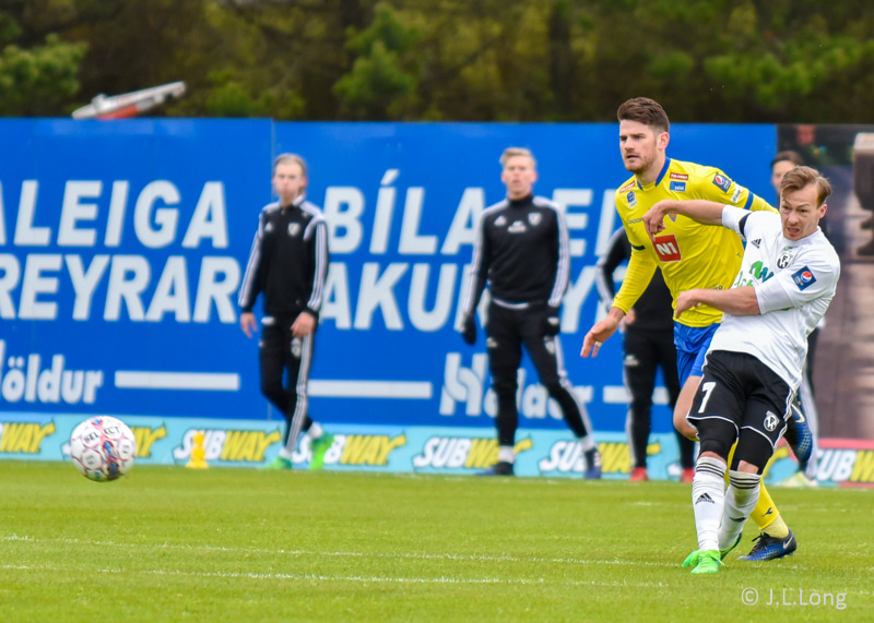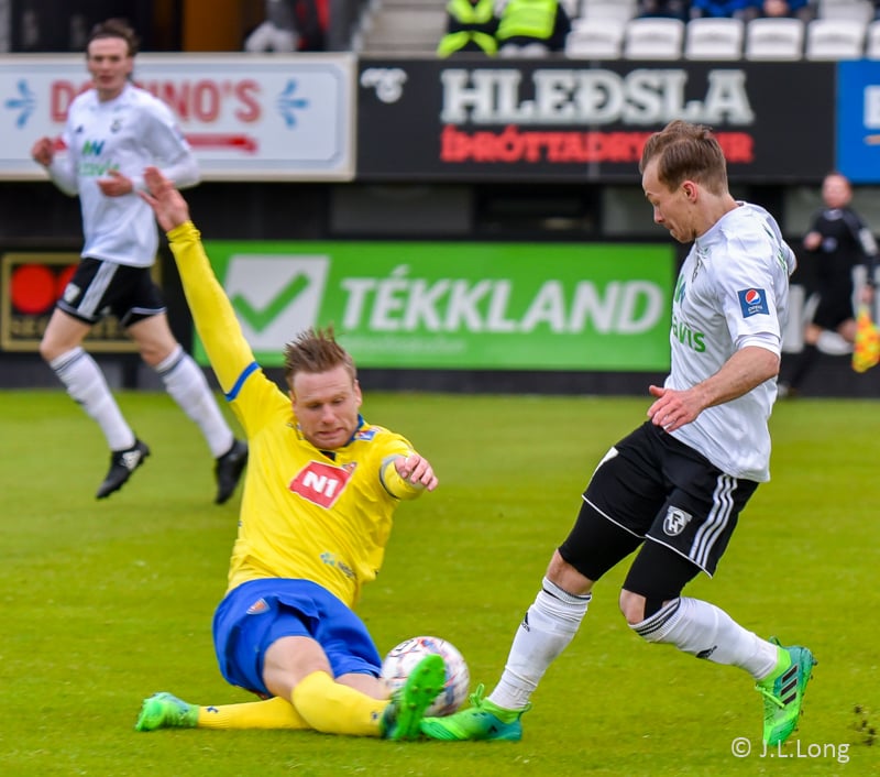 Almarr liggur eftir á miðjunni eftir samstuð við Emil Páls. Emil ætlaði sér þarna að spila fast og fékk dæmda á sig aukaspyrnu.
