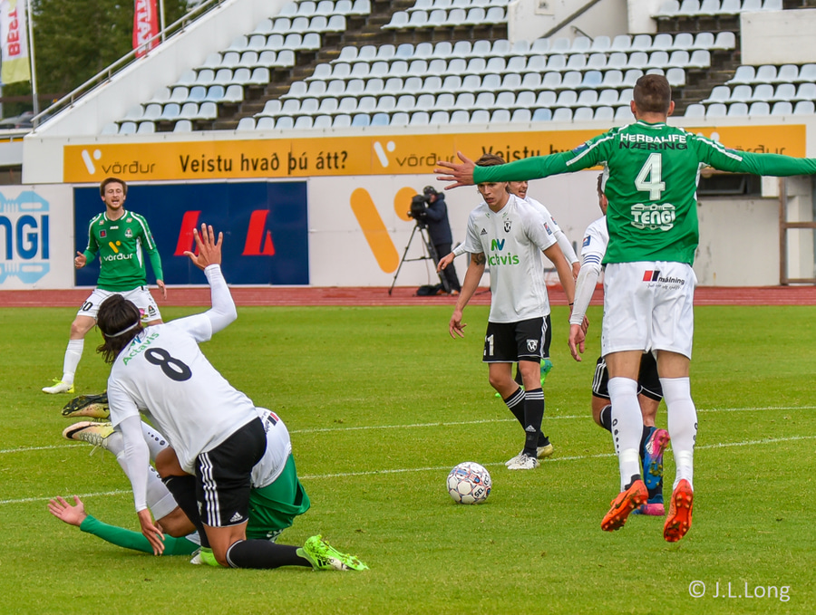 Boltinn skoppar um teiginn og endar á Pétri Viðars sem húkkar hann en framhjá á fjær.
