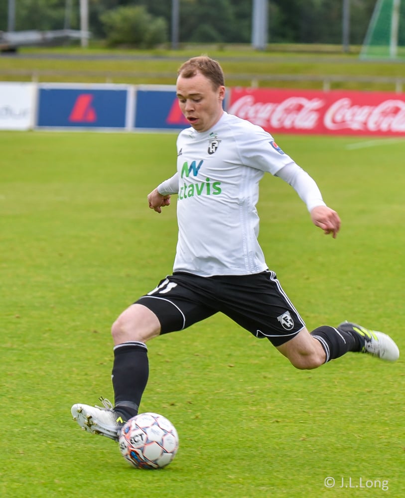 Kristján fær boltann á D-boganum og leggur til hægri þar sem Bergsveinn kemur og sendir djúpt á fjær þangað sem Kristján er mættur til að stanga hann inn.
