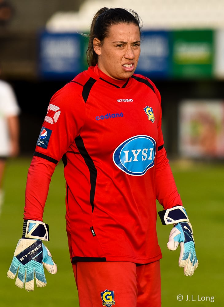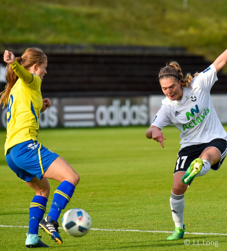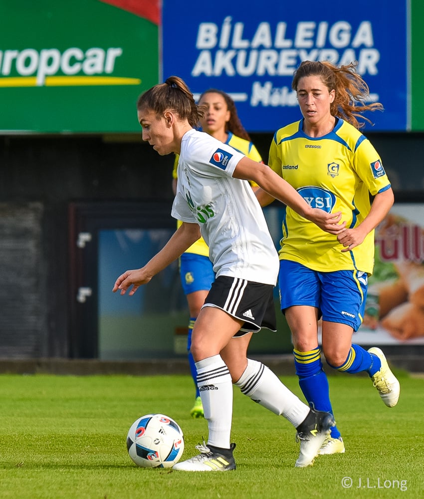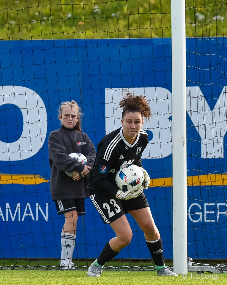 Victoria Frances er komin hér í dauðfæri, ein gegn Viviane eftir frábæra sendingu frá Caroline! Skot Victoriu er á leiðinni í markið, í gegnum klofið á Viviane en hún nær á einhvern ótrúlegan hátt að verja hann með hælnum og koma honum rétt framhjá stönginni!!