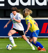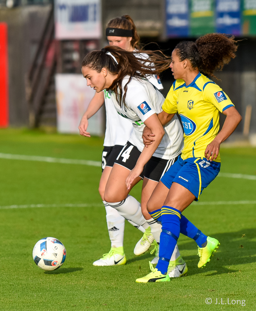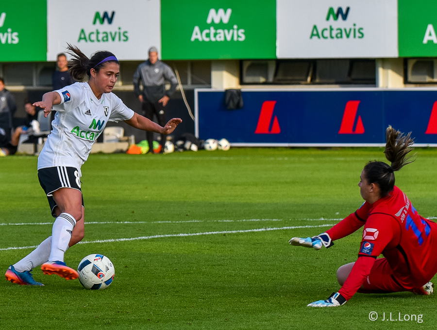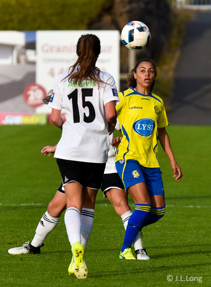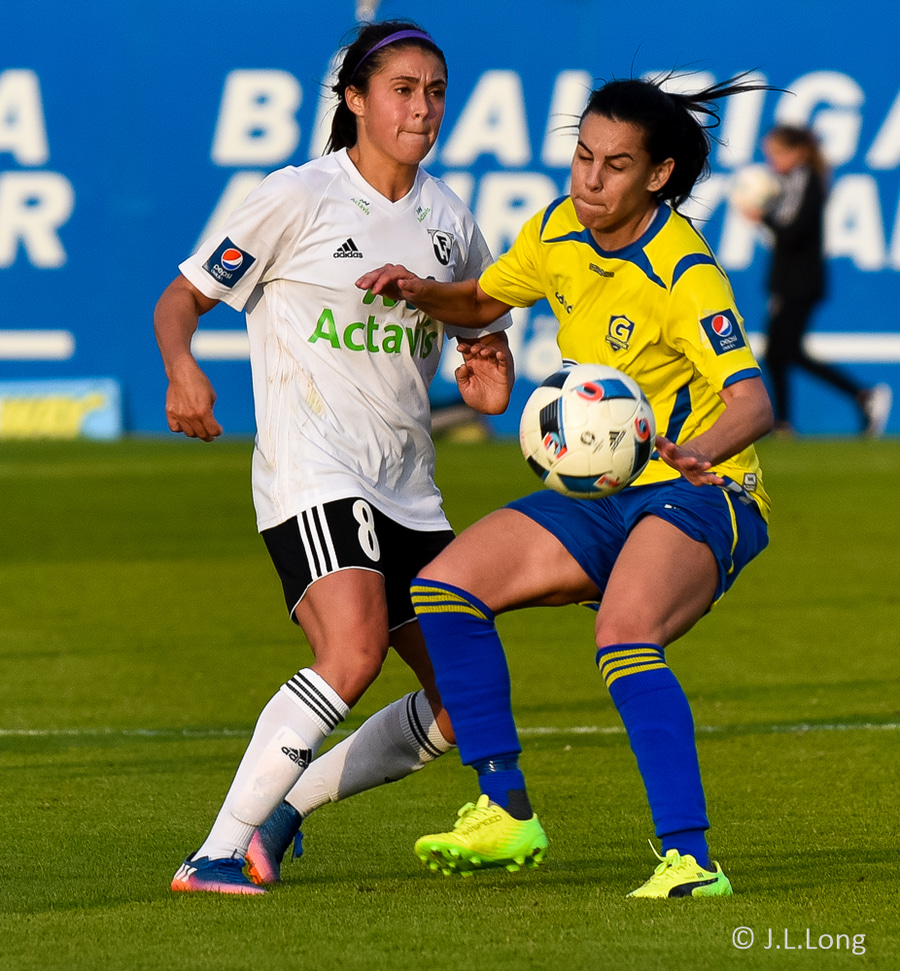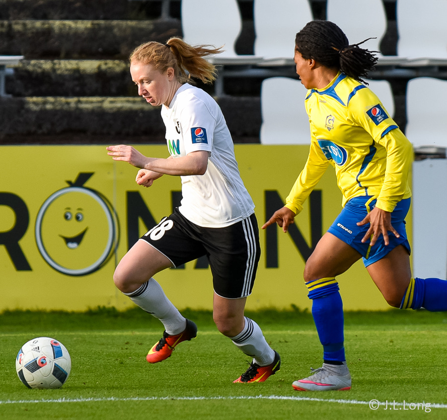 Victoria Frances er komin hér í dauðfæri, ein gegn Viviane eftir frábæra sendingu frá Caroline! Skot Victoriu er á leiðinni í markið, í gegnum klofið á Viviane en hún nær á einhvern ótrúlegan hátt að verja hann með hælnum og koma honum rétt framhjá stönginni!!