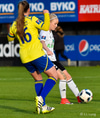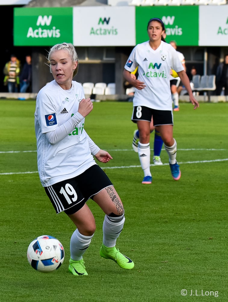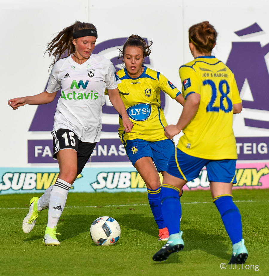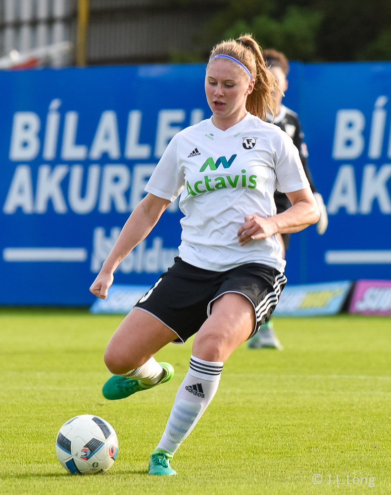 Lauren er að sleppa framhjá Maríu Selmu á hægri kantinum en María hangir í treyjunni hennar. Lauren nær að slíta sig lausa og tekur á rás upp að endamörkum, reynir að koma þessu á samherja en FH stelpur hreinsa, en bara beint á Berglindi sem reynir skot, það er fast, en beint í varnarmann.