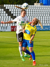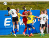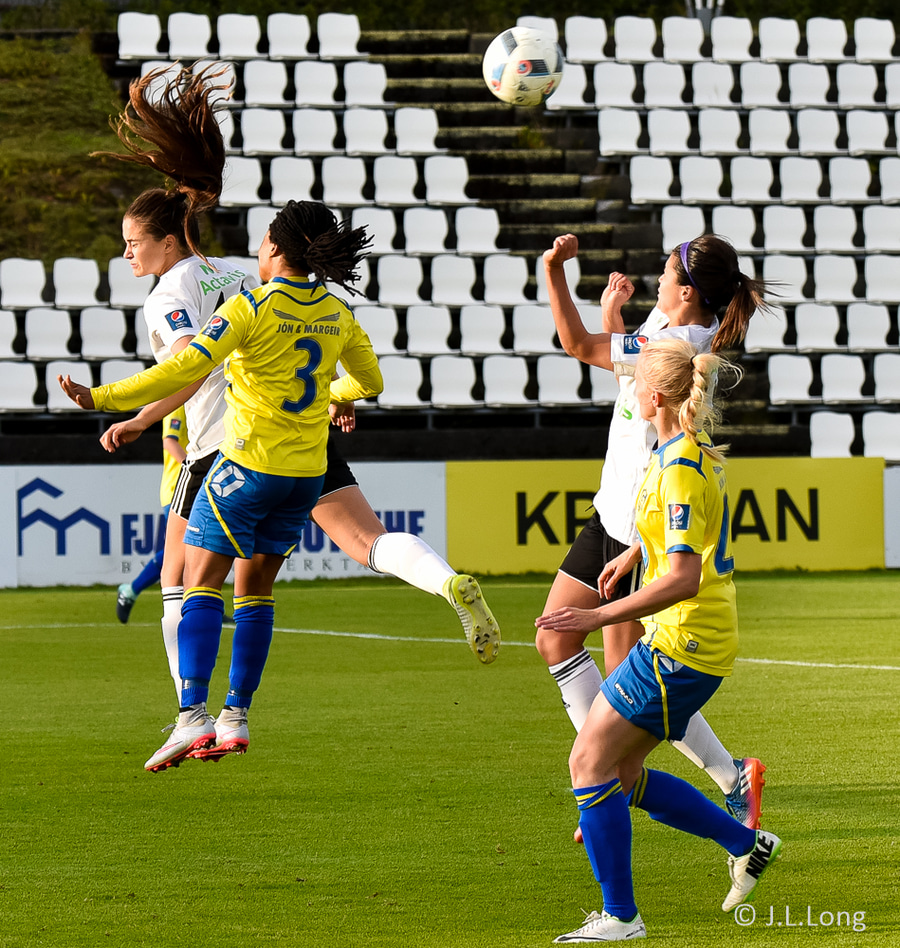 Kirstín tekur hornið sem er hátt útí teiginn. Þar er Linda sem reynir skallann en þessi er of utarlega og of hár fyrir hana. Ekkert verður úr þessu.