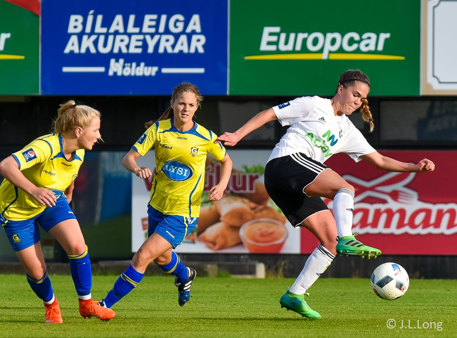 Guðný á hérna fínt hlaup upp völlinn og rennir svo boltanum út á Ernu Guðrúnu, en fyrsta snerting Ernu er slök og hún missir hann útaf.